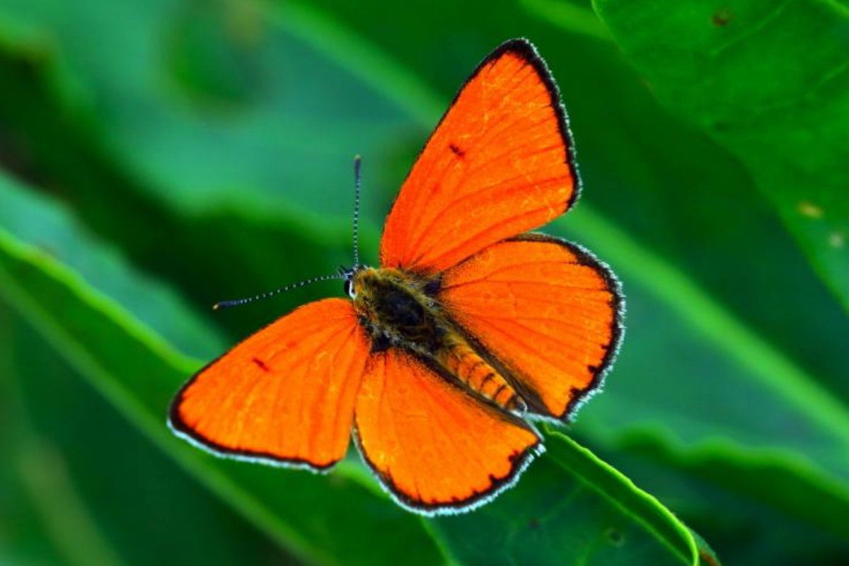 Magyar neve nagyon találó, hiszen szárnyai égő tűzvörös színben pompáznak. A hímek és a nőstények különböznek. A hím szárnyainak felszíne lángvörös, a felső szárnyakon egy-egy apró fekete folt díszeleg. A szárnyakat vékony fekete sáv szegélyezi, a szárnyrojtok pedig hófehérek.