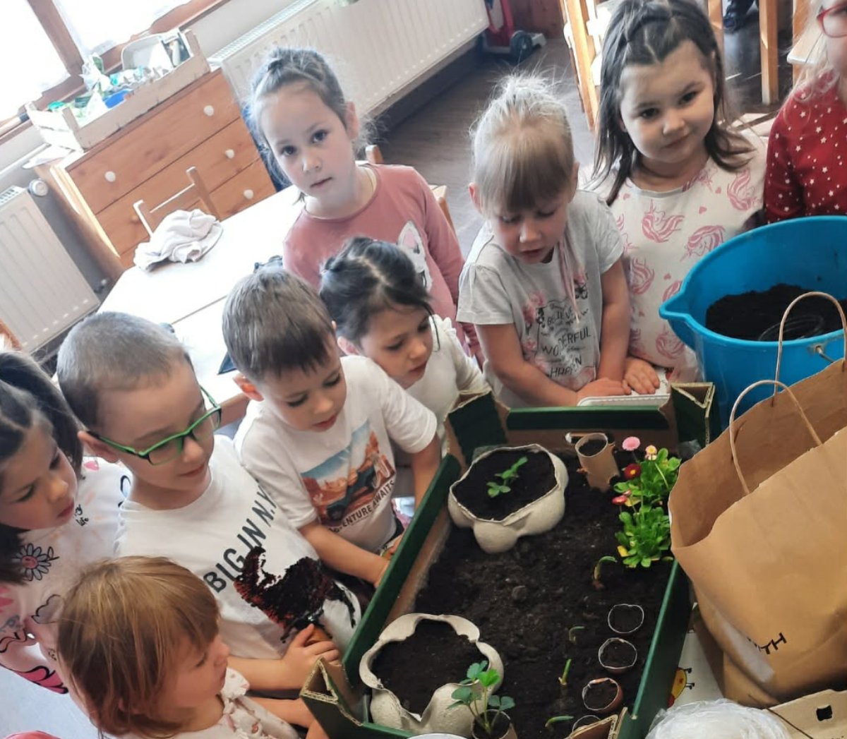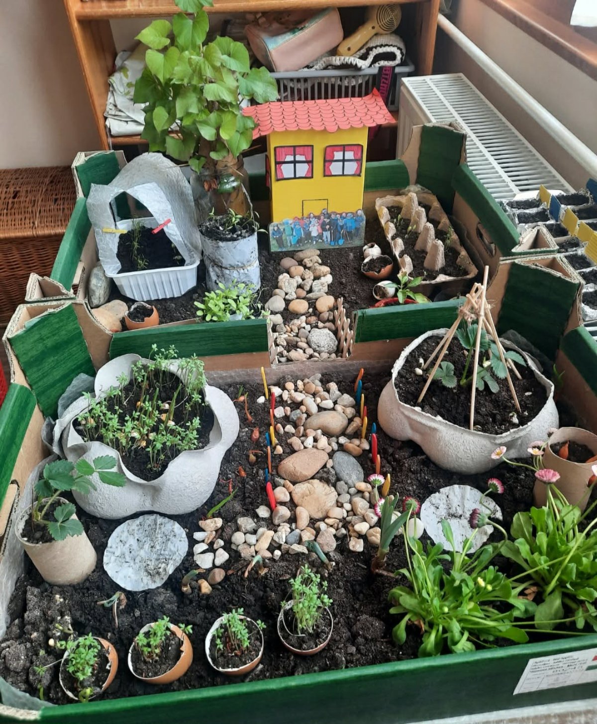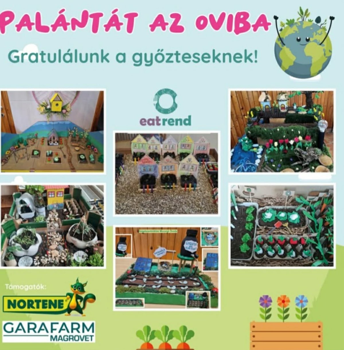 Éppen ezért nagy örömmel és büszkeséggel osztom, osztjuk meg a hírt, hogy óvodánk sikeresen szerepelt a „Palántát az oviba!” pályázaton, amelyre országos szinten több, mint 150 intézmény jelentkezett. A pályázat célja a környezettudatos szemlélet erősítése az óvodás korú gyerekekben, valamint a gyerekek természettudatos magatartásának megalapozása, fejlesztése – olyan értékek, amelyek számunkra is kiemelten fontosak. Csoportomban a gyerekek bevonásával olyan újrahasznosított anyagok felhasználásával kellett kertmakettet megalkotni, melyet óvodánk udvarának képzeltünk el. Ötleteim megvalósításában segítséget kaptam mentoráltamtól és lelkes támogatást intézményünk Igazgató Asszonyától.