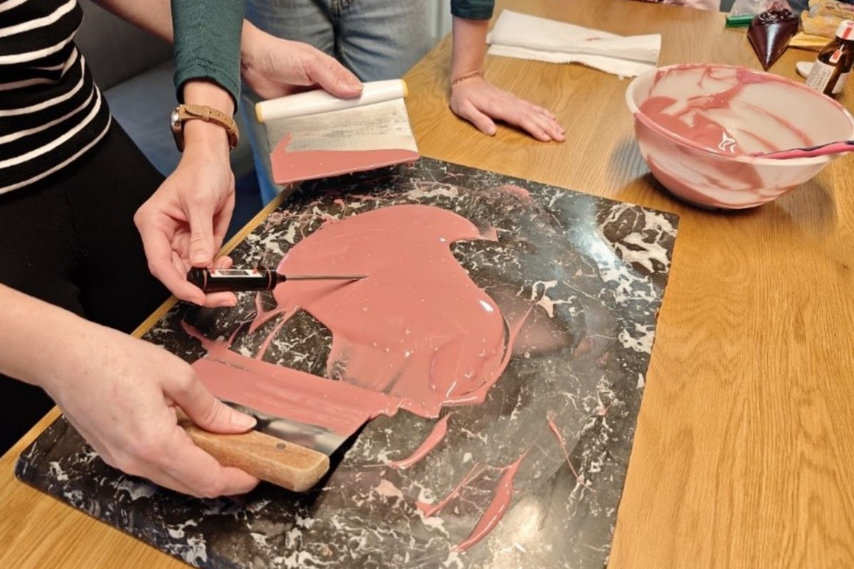 A következő szakaszban a fiatalok maguk is csokoládékészítővé váltak. A temperálás során megismerkedtek a kakaóvaj kristályszerkezetének változásaival – egy olyan jelenséggel, amely egyszerre kémiai folyamat és érzékszervi élmény.