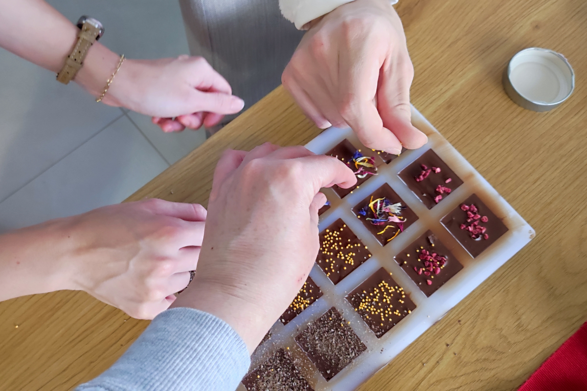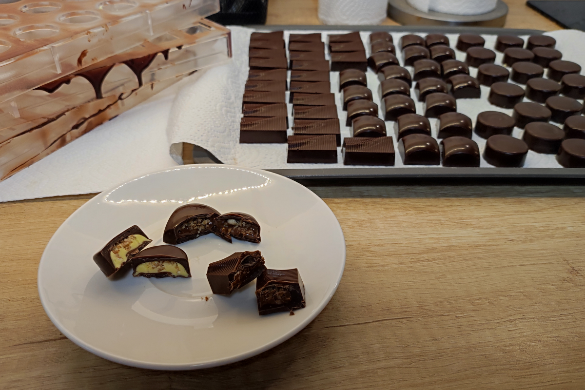 A program másik alkalmával klasszikusabb ízek jelentek meg: az étcsokoládéval készített bonbonokat közkívánatra roppanós, mogyorós krémmel, illetve citromkrémmel töltöttük, továbbá táblás csokoládékat készítettünk, amit mindenki ízlés szerint dekorált. Ez a sokszínűség nemcsak az ízekben, hanem a tanulási élményben is megmutatkozik: a résztvevők összehasonlíthatták az alapanyagokat, textúrákat és technológiákat.
