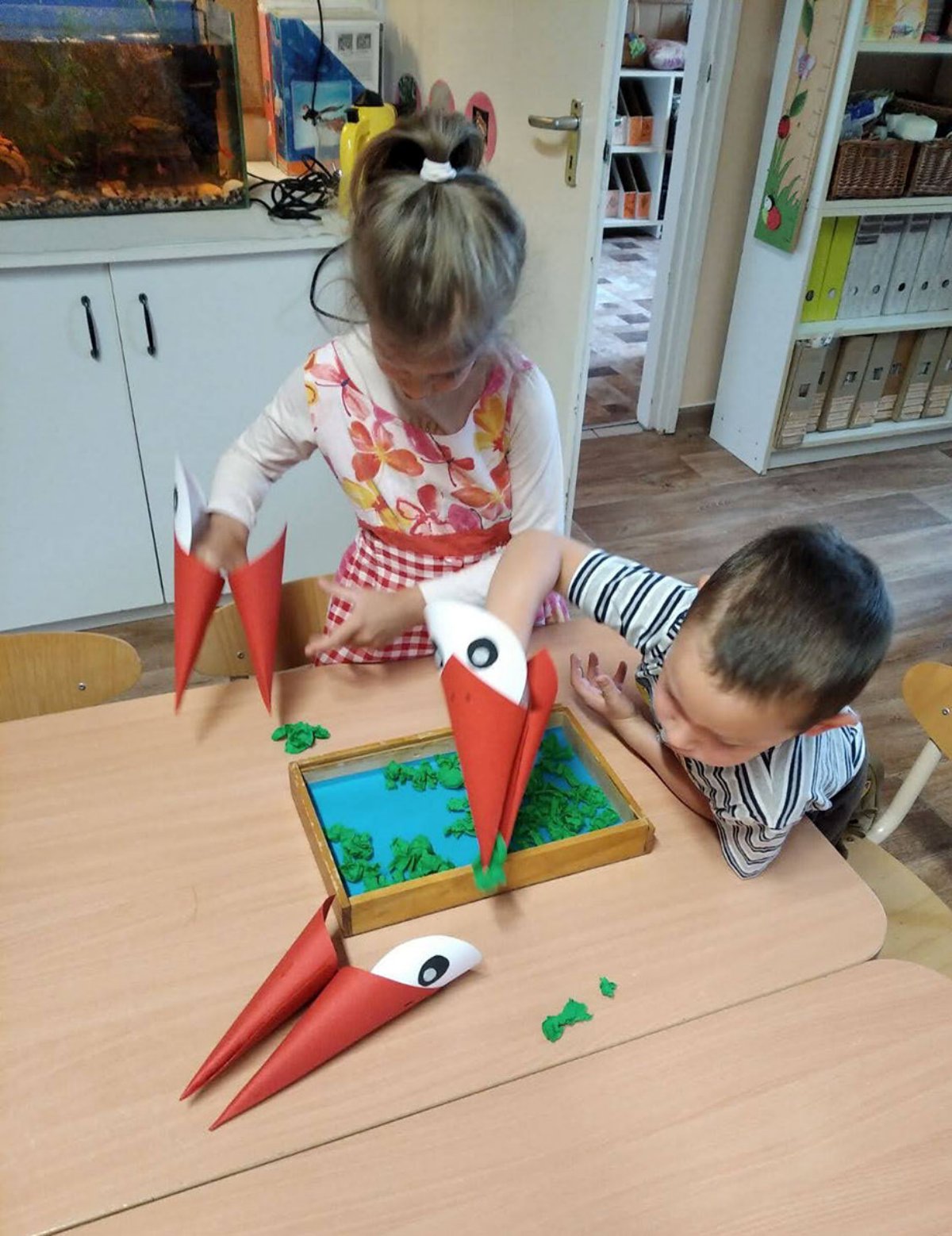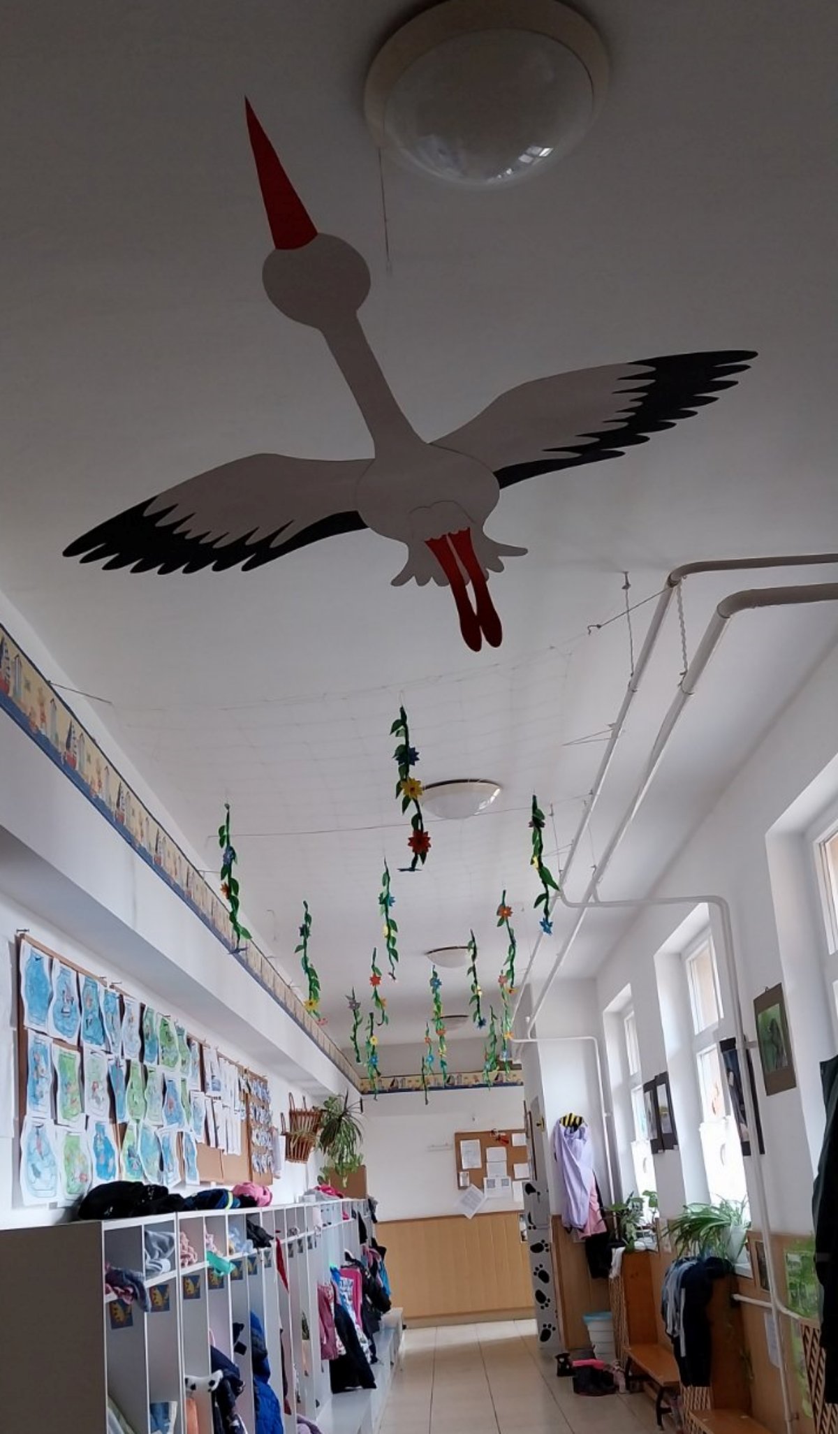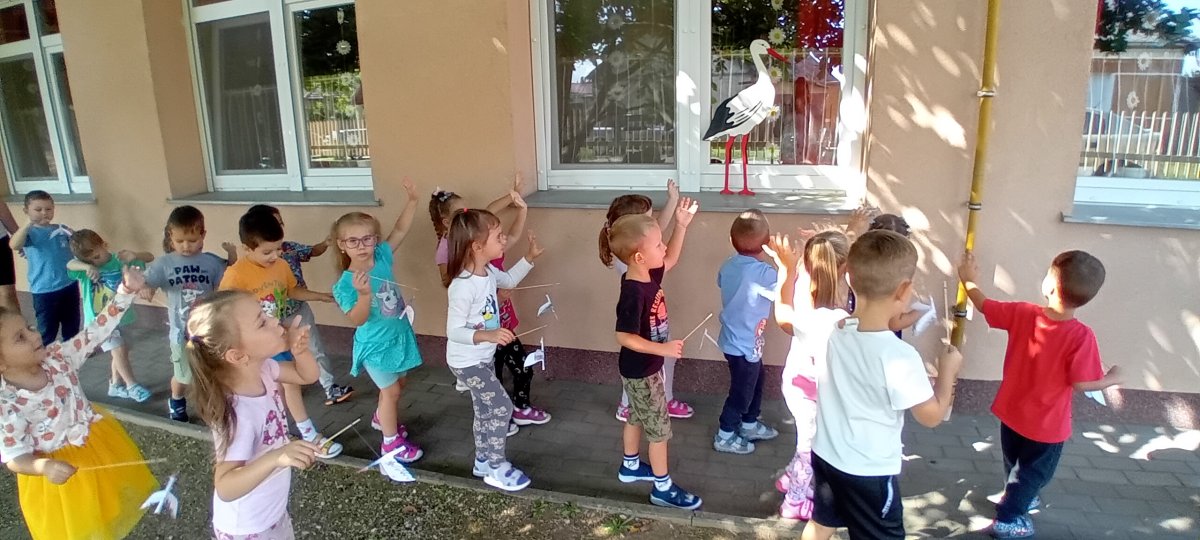 Reggel óta az ablakon „kukucskál” befelé. Mi felnőttek várjuk, hogy a gyerekek mikor veszik észre, majd behozzuk a csoportba. Énekkel, verssel köszöntjük és megkérjük, meséljen arról, mi történt vele, amióta útra kélt, válaszait nagyon várják a „Kis Pillék”. Készítünk gólyákat, amiket hazavisznek. A technikák, felhasznált anyagok változatosak, törekszünk az újra hasznosításra és figyelembe vesszük a gyerekek életkori sajátosságait, miközben játékosan felelevenítjük a gyerekek ismereteit a költöző madarakról. Párja, Kamilla, néhány nap elteltével érkezik. Ő a folyosónkat díszíti kitárt szárnyaival. Nyár végéig velünk maradnak.