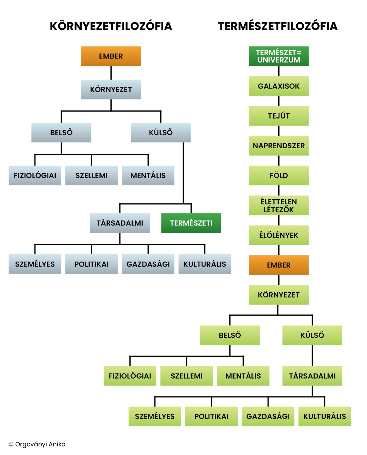 - Környezetfilozófia (bal oldal): itt az EMBER (narancssárga) áll legfelül. Ez egy klasszikus antropocentrikus modell: a világot az emberi létezés szűrőjén keresztül nézzük. Minden más (belső és külső környezet) csak az emberhez való viszonyában értelmezhető.