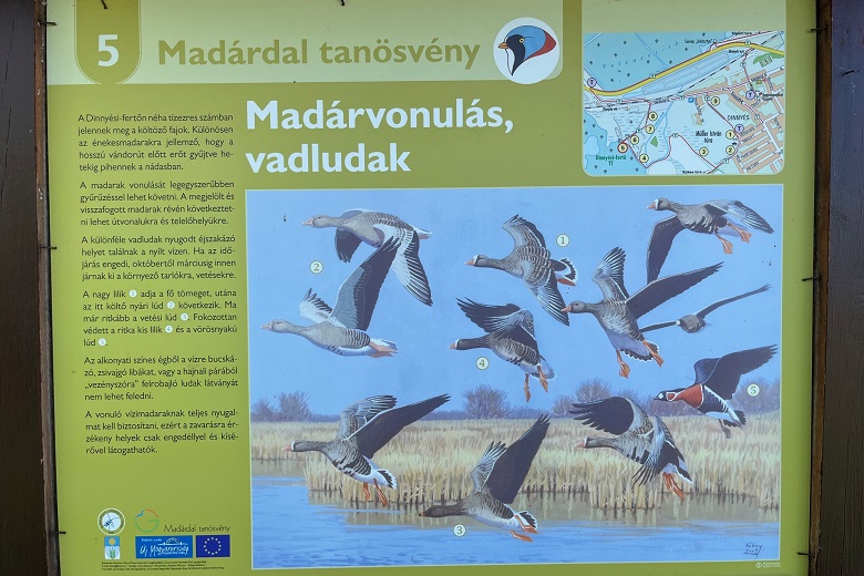 A három szakaszból álló, összesen 15 km hosszú tanösvényt végigjárva megismerkedhetünk a Dinnyési-fertő természetes állapotú vizes élőhelyeivel, a szikes vízparti területekkel, valamint az itt előforduló gazdag élővilággal. A tanösvényen külön táblákon olvashatunk a nádi énekesmadarak, vöcskök, gázlómadarak, récefélék életmódjáról és a madárvonulásról.