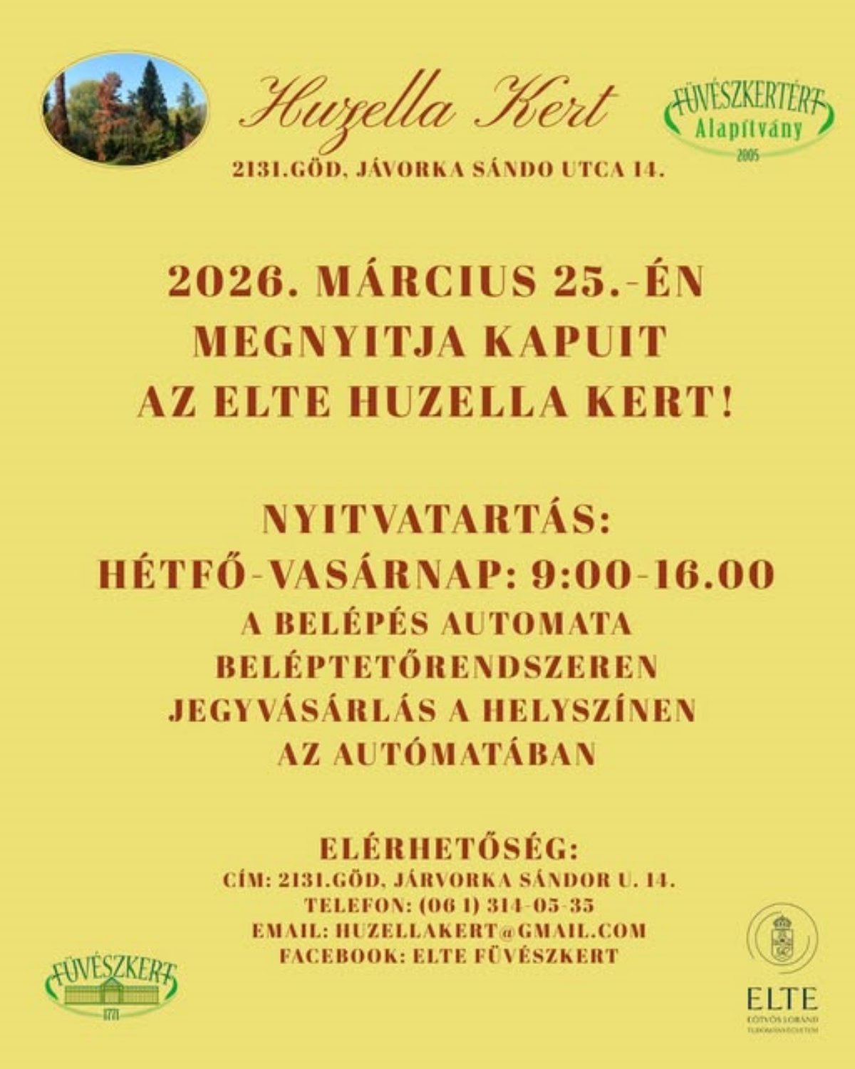 Az ELTE Huzella Kert az Füvészkert gödi telephelye, amely a látogatók számára ökoturisztikai látogatóközpontként, illetve a szakma számára ökológiai kutatóközpontként is szolgálni fog. Várjuk látogatóinkat egy kellemes sétára, illetve a jövőben az ELTE Füvészkerthez hasonlóan megrendezésre kerülő tematikus programokra, szakvezetésekre, rendezvényekre.