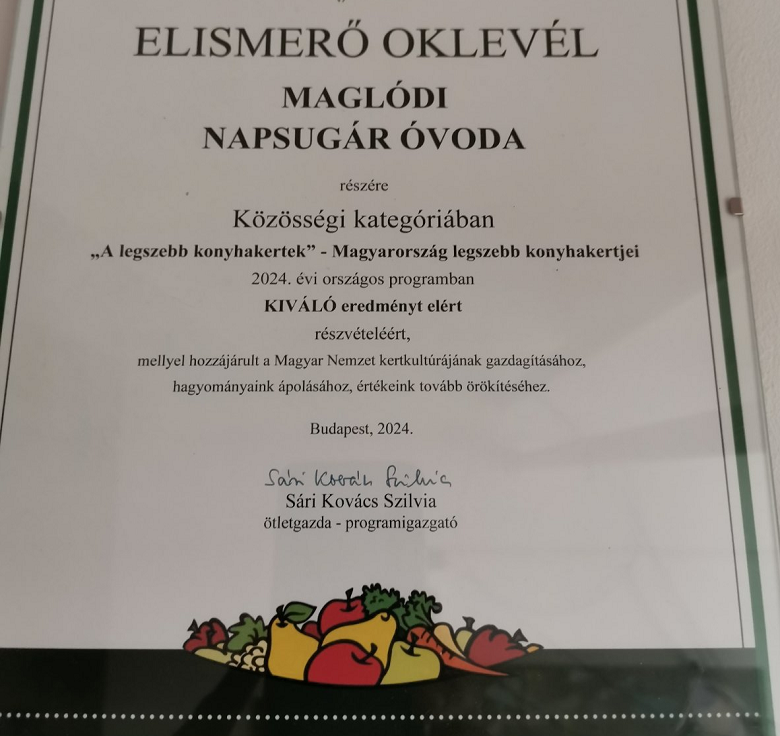 2024-ben oklevelet is kaptunk: „A legszebb konyhakertek” közösségi kategóriában kiváló eredményt értünk el.