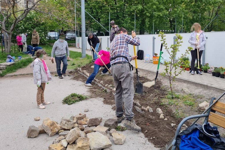 Szülők, tanárok és gyerekek együttesen ásták fel, virágokat, és fűszernövényeket ültettek a meglévő gyümölcsfák mellé. Mi nem rendelkezünk megfelelő és kellő számú szerszámokkal, így egy előzetes tájékoztató levél kiküldése után a szülők hoztak magukkal ásót, kapát, gereblyét, vödröket és kislapátokat. A növényeket szülői adományként kaptuk a jó cél érdekében.