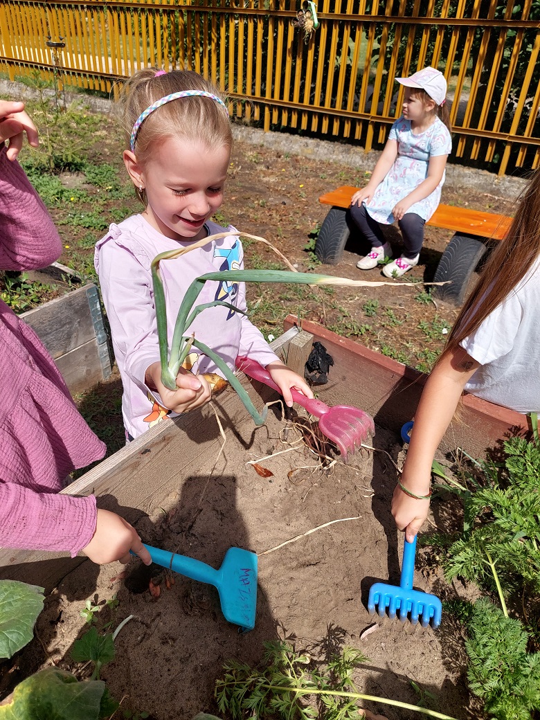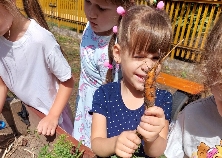 A zöldségeket: sárgarépa, paprika, paradicsom, hagyma, borsó nyersen fogyasztjuk. A különböző tökféléket rántjuk, sütjük, ehető magját pirítjuk. A gyümölcsfáinkon termett gyümölcsökből kompótot, süteményt, salátát is készítünk. Gyógynövénykertünkben citromfű, levendula, menta, rozmaring is díszlik. Szörpöt, limonádét, illatosító párnákat, csokrokat készítünk ajándékba, illetve az óvodánk helyiségeit illatosítjuk a közösen gondozott növényeinkből. 2024-ben bekerültünk tagóvodánkkal az Országos Óvodakert programba. Folyamatosan műveljük emeltágyásainkat, virágos udvarrészeinket a szakszerű útmutatás mentén, amit az Iskolakertekért Alapítvány biztosít számunkra. A program segít bennünket abban, hogy rendszerszemléletet alakítsunk ki, a projektet megfelelő ütemben végezzük, és munkánk gyümölcse valóban beérjen. Folyamatosan kutatjuk a szakmai tanácsokat nyújtó cikkeket, tanulmányokat, hogy szakszerűen gondozzuk a kertjeinket, és jó példát mutassunk.